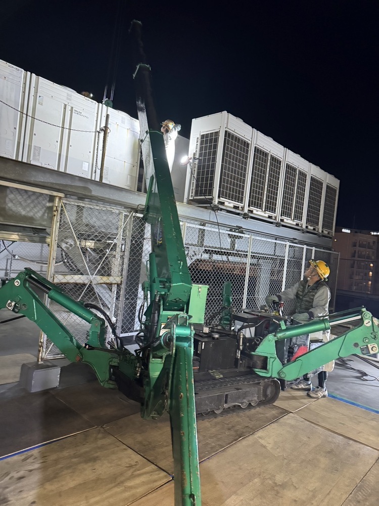 2025.04.24 施工事例 屋外室外機の搬出工事 屋外室外機の搬出工事屋上にミニクローラクレーン、通称カニクレーンを搬入し不要な室外機を吊り出し、クレーンにて吊り降し可能な箇所まで移設。繁華街での工事の為夜間の作業で周辺道路に配慮し工事しました。
